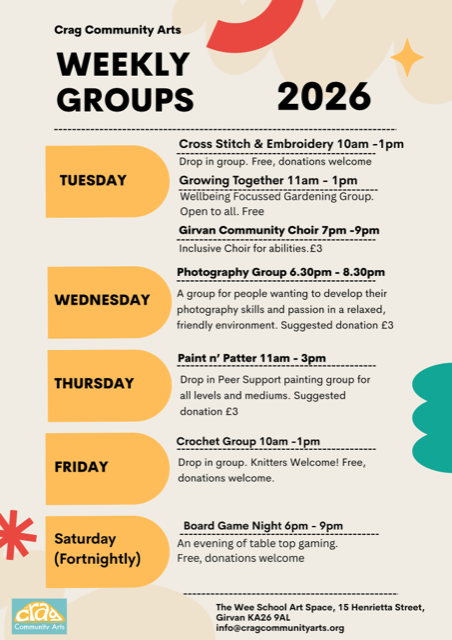 Tuesday- Cross Stitch & Embroidery 10am- 1pm; Free, Donations Welcome. Gardening Group 11am- 1pm; Free, Donations Welcome. Community Choir 7pm- 9pm, £3.